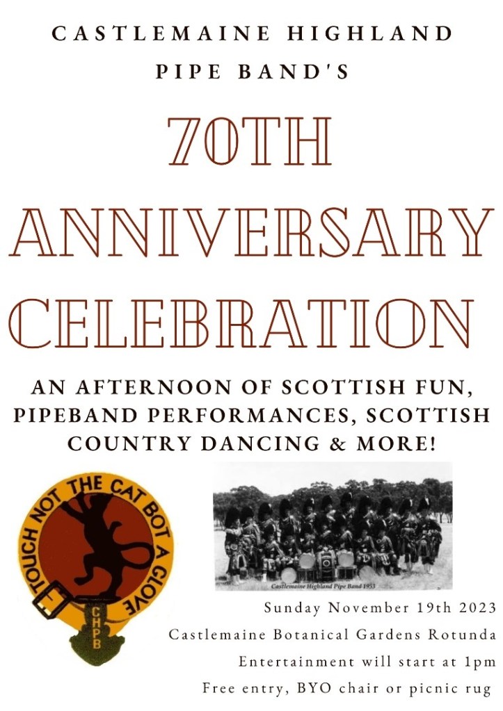 Gallery 2023 – 70th Anniversary Celebration 2023 – Australia Day at Castlemaine 2023 – Maryborough Highland Gathering Before 2023 Share this: Click to share on X (Opens in new window) X Click to share on Facebook (Opens in new window) Facebook Like Loading...